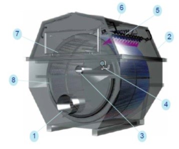 Корпусной барабанный сетчатый фильтр представляет собой ту же конструкцию, но в герметичном корпусе. Предназначен такой тип для установки в готовом помещении, где недопустим разлив воды на пол и подвод воды осуществляется не по каналу, а по трубе. Выглядит это так: